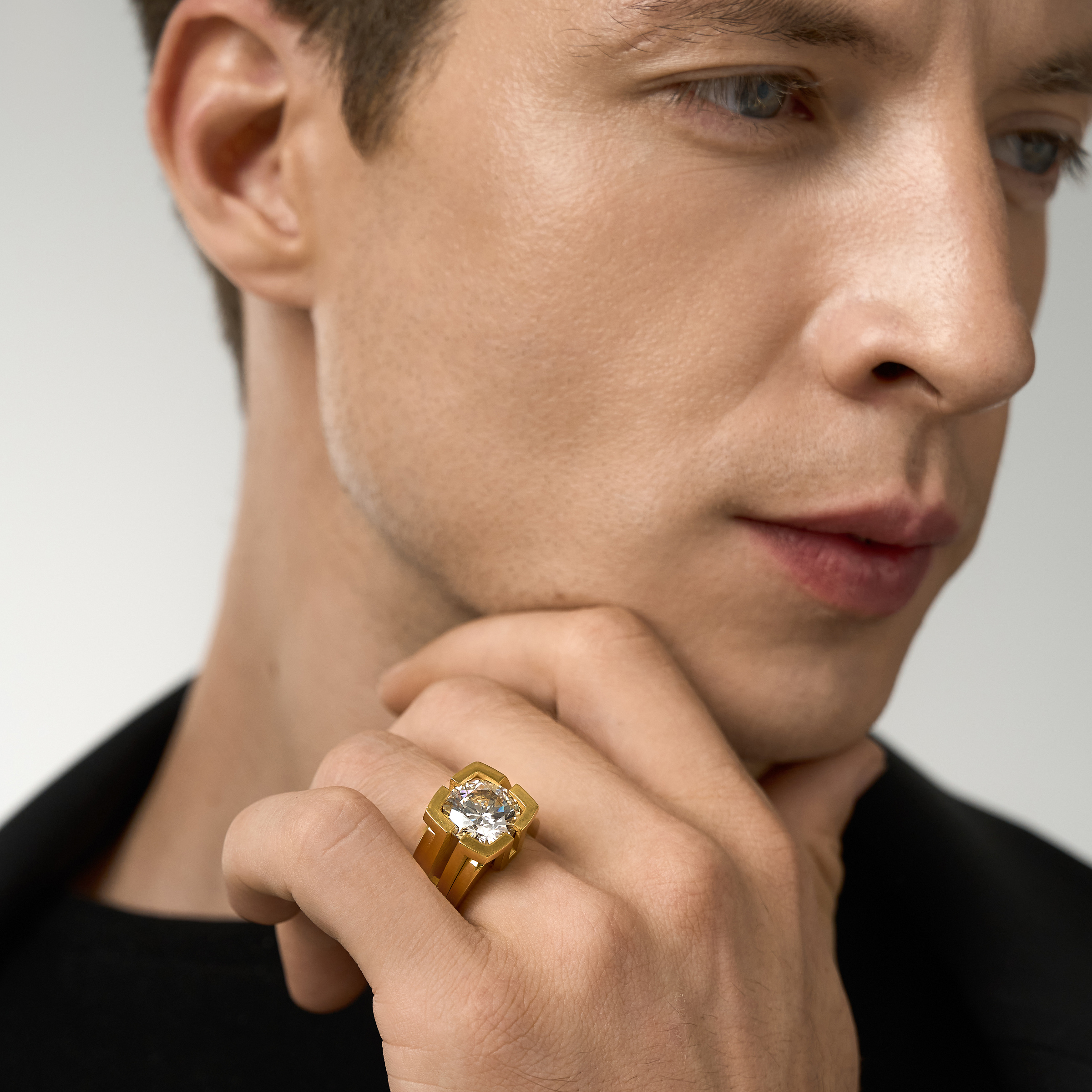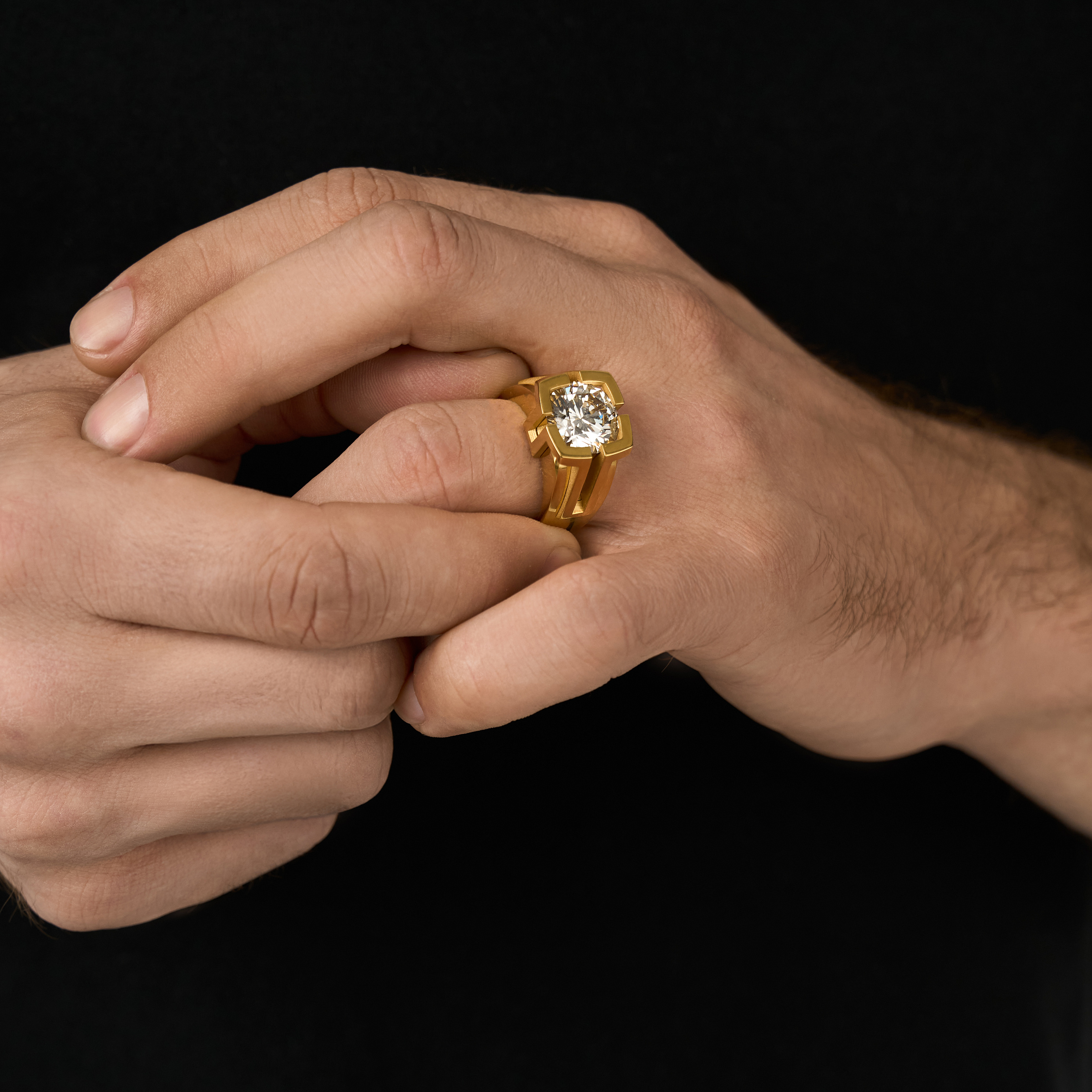 An unsurpassed men's diamond ring is the epitome of simplicity and poise. The perfectly polished gold surface of the ring highlights the mysterious shimmer of the diamond.